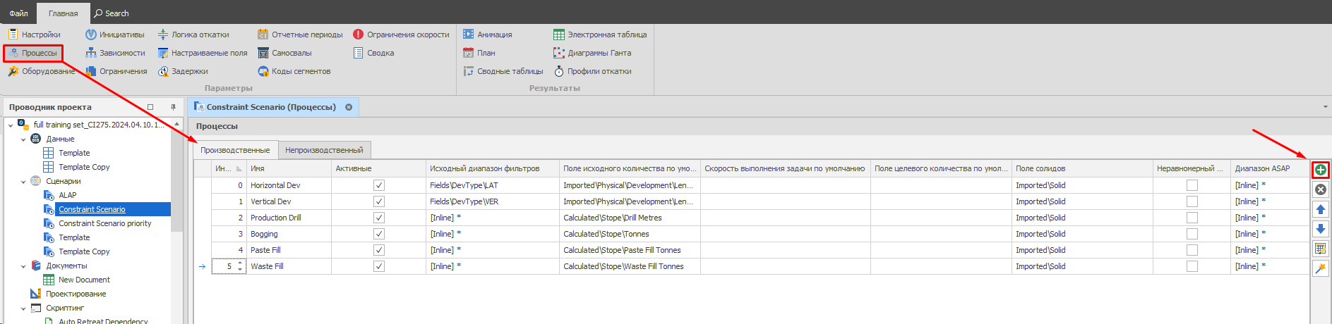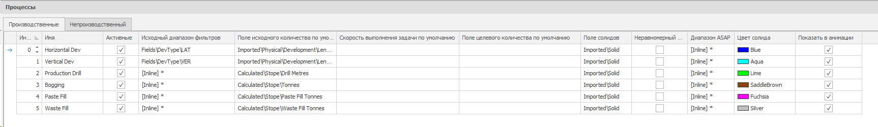 В Micromine Advance процессы (Processes) используются для планирования и управления задачами, выполняемыми оборудованием. Процессы могут быть: