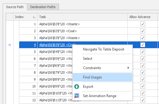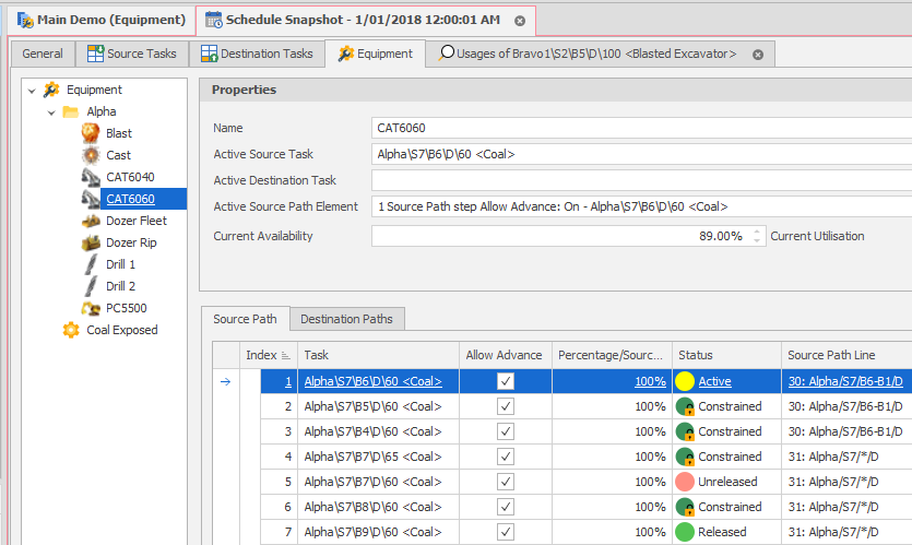 Вкладка Equipment (оборудование) в Snapshot Viewer позволяет просматривать пути перемещения (Source Paths) и, при необходимости, пути назначения (Destination Paths) для каждого типа оборудования (Equipment) в графике выполнения задач.