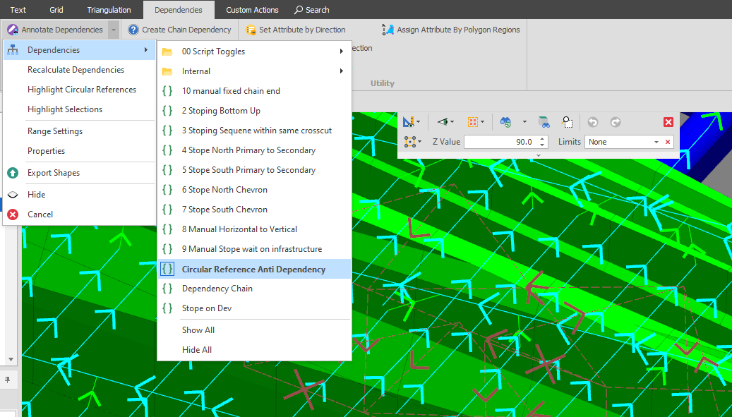 Антизависимости используются для разрешения циклических ссылок. Представьте ситуацию, в которой штрек складирования (Stockpile Tunnel), отходящий от основного уклона, имеет зависимости, которые заставляют уклон прекратить проходку до завершения склада. Типичный способ реализации этого — использование геометрической зависимости (Geometric Dependency), которая связывает тоннель уклона с последним узлом склада. Проблема в том, что геометрические зависимости не различают объект пересечения, поэтому в результате несколько узлов уклона становятся потомками последнего узла склада.